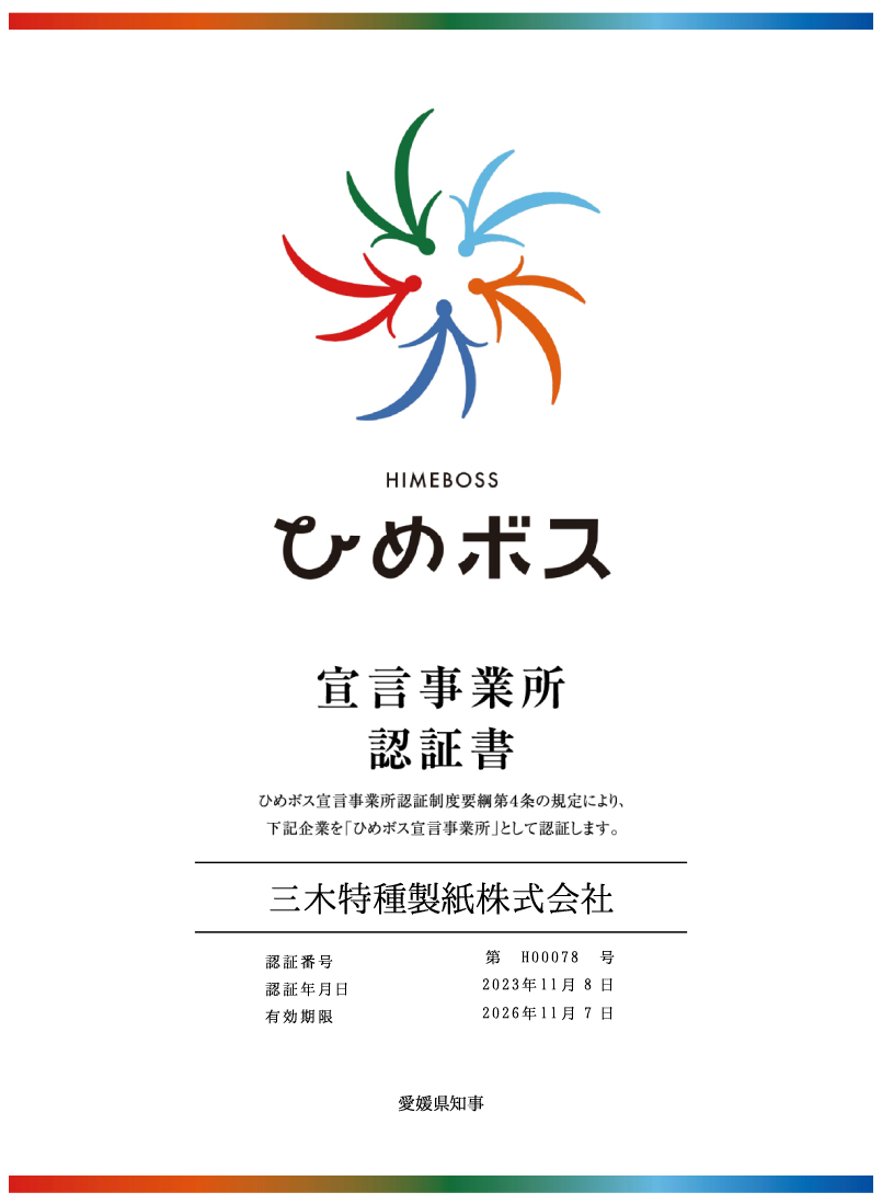 | 2000年代 | 湿式スパンレース不織布の生産を開始。 KES・環境マネジメントシステム・スタンダードのステップ2の認証を取得。 三木特種加工紙株式会社と合併。 ISO14001環境マネジメントシステムの認証を取得。 |