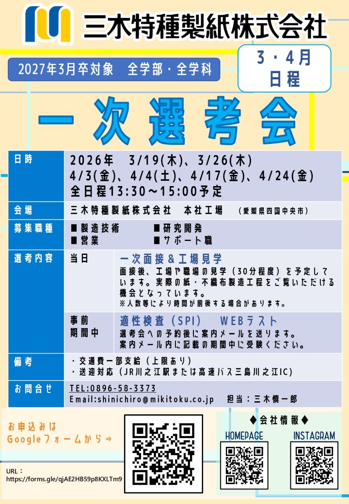 2027年3月卒業予定の学生の皆さまを対象に、一次選考会を開催いたします。