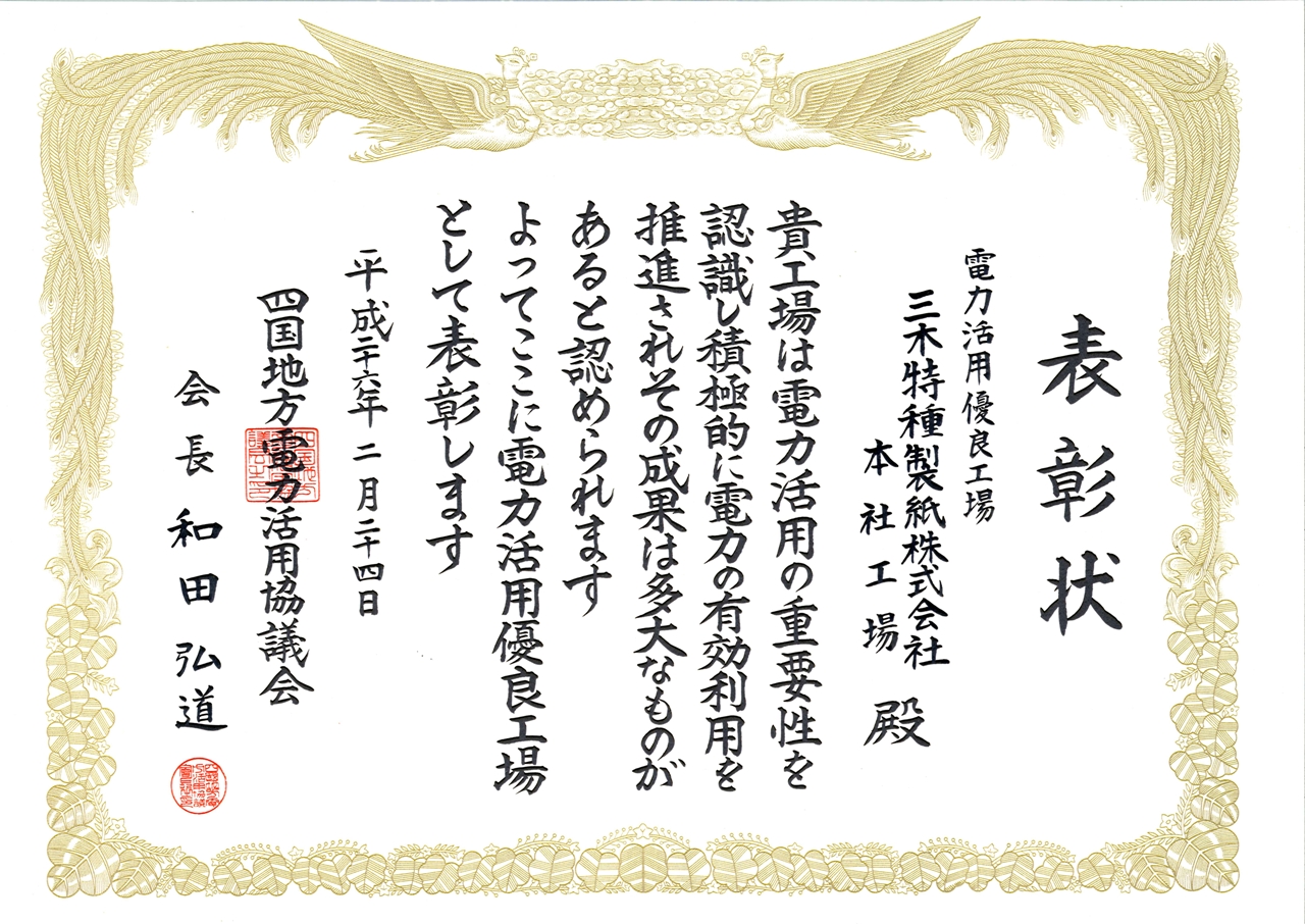 表彰式では、省エネルギー機器の積極的な導入や運転管理方法の改善等により、省エネルギーの推進に功績のあった個人及び工場等に対し四国経済産業局長表彰、一般財団法人省エネルギーセンター四国支部長表彰、四国地方電力活用協議会会長表彰が授与され、当社は、電力活用優良工場として、四国地方電力活用協議会会長表彰を受賞しました。